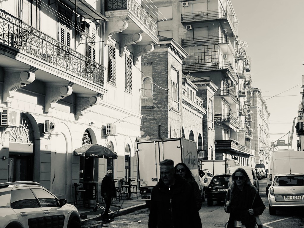 Angenehm an Rijeka ist, was anderen Dorn im Auge sein mag. Dass mit dem architektonischen Erbe nicht sonderlich pfleglich umgegangen wird. Häßlicher Glanz stößt in die Lücken von k.u.k-Oppulenz, Neumodisches reibt sich an post-sozialistischen Resten. Ruinen leben. Neubauten verwesen. Eine verkehrte Welt, in der wie selbstverständlich verkehrt wird, so erscheint es. Zu Fuß. Mit dem Auto. Dem Schiff im Hafen. Das Ahh und Ohh anderswo verliert sich in entspannter Ignoranz. Ein Gewinn. Ich lernte mal einen Inder aus Chandighar kennen. Die Stadt wurde von Corbusier erbaut. Ehedem, it dem Segen Nehrus. Der Student wusste nichts davon. In Rijeka verhält es sich ähnlich. Die Architektur wird hingenommen. An wen sie erinnert, schert nicht wirklich. Gebäude bleiben zumeist unbeachtete Zeitzeugen.