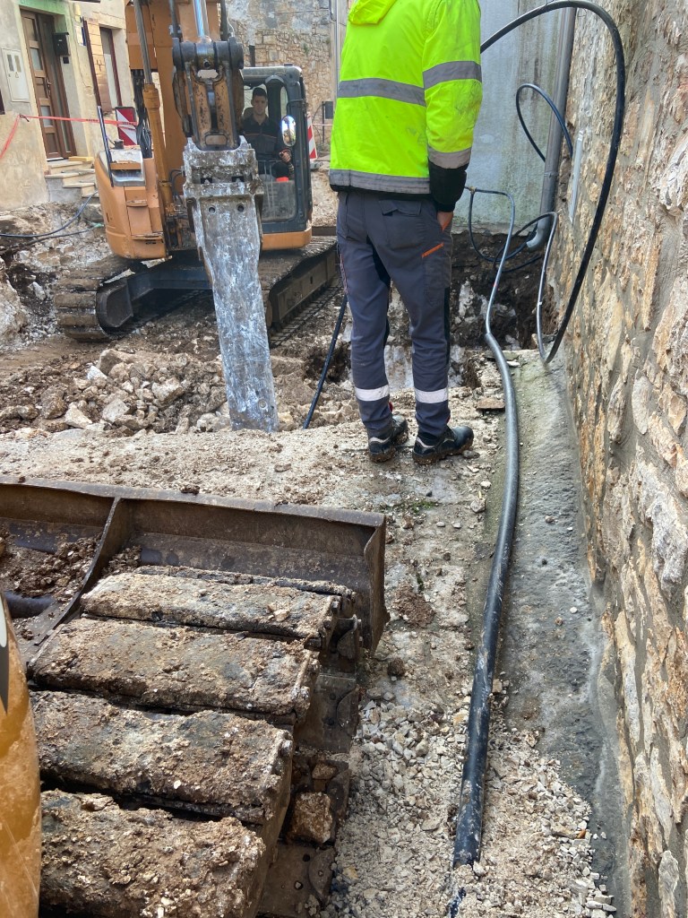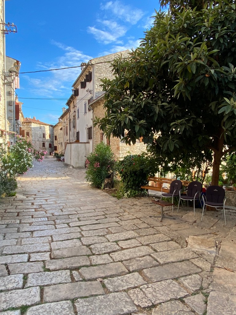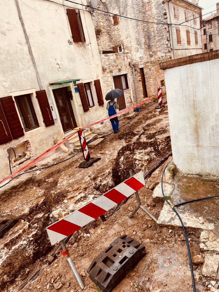 Dass jetzt die Zeit knapp wird, alles herzurichten, ist klar. Wo schon die ersten Feriengäste zum Fotoshooting anrücken. Sich manche vergewissern wollen, ob wahr ist, was in Reiseführern steht. Dass Bale eine Perle Istriens ist. Die Gemeinde drückt jetzt aufs Tempo. Das ist überall zu sehen. Und zu hören. Bagger rattern schon morgens die Fenster entlang, setzen dem Schlaf früh ein Ende. Alte Steine, die rausgerissen worden waren, werden geschliffen und neu eingesetzt. Ein Job, der Geschick und eine Menge Kraft verlangt.