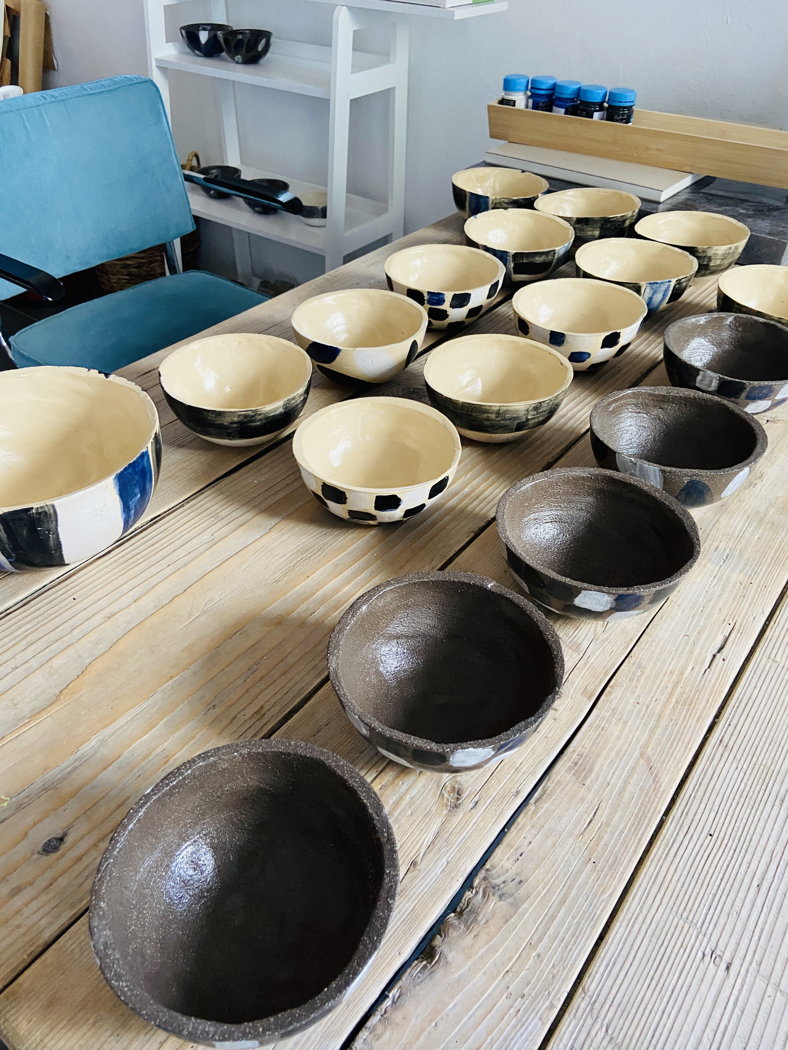 Das Sortiment an Keramik-Schalen wird größer. Vielfältiger. Ohne seinen Charakter zu verlieren. Jede Schale, groß oder klein, ist individuell gefertigt und gestaltet. Diesmal haben wir vor allem hellen Ton benutzt. Zuvor war es schwarzer Ton. Die Kermaik-Werkstatt in Raša, selbst ständig in Produktion, bietet nach wie vor ihre Unterstützung an. Es entwickelt sich weiter eine schöne Zusammenarbeit. Mittlerweile haben wir fast 50 Schalen dort brennen, glasieren und wieder brennen lassen. Die jüngsten wurden direkt aus dem Brennofen geholt und für den Transport verpackt. Sorgsam, Stück für Stück. Aus Respekt vor den Arbeiten.