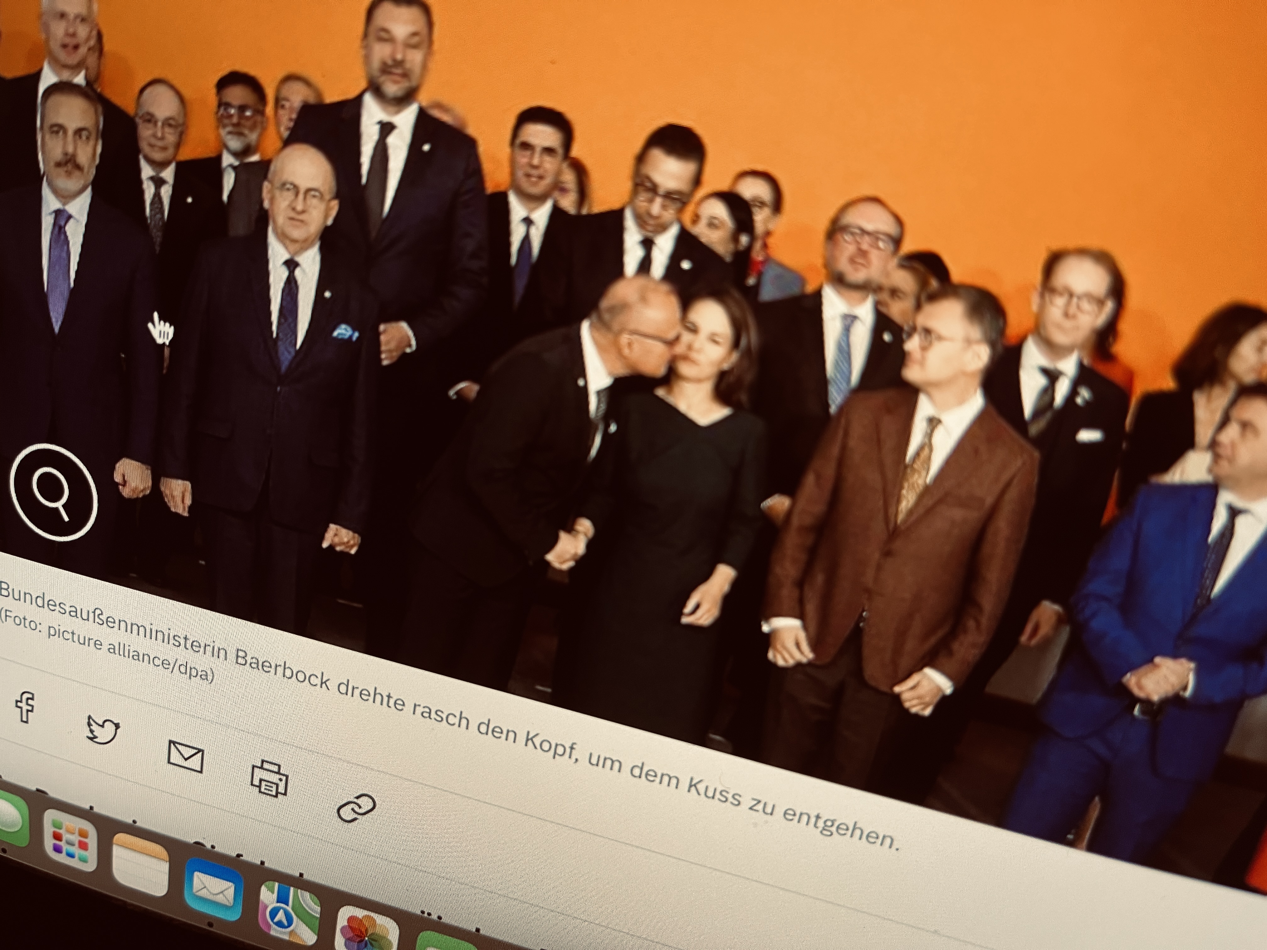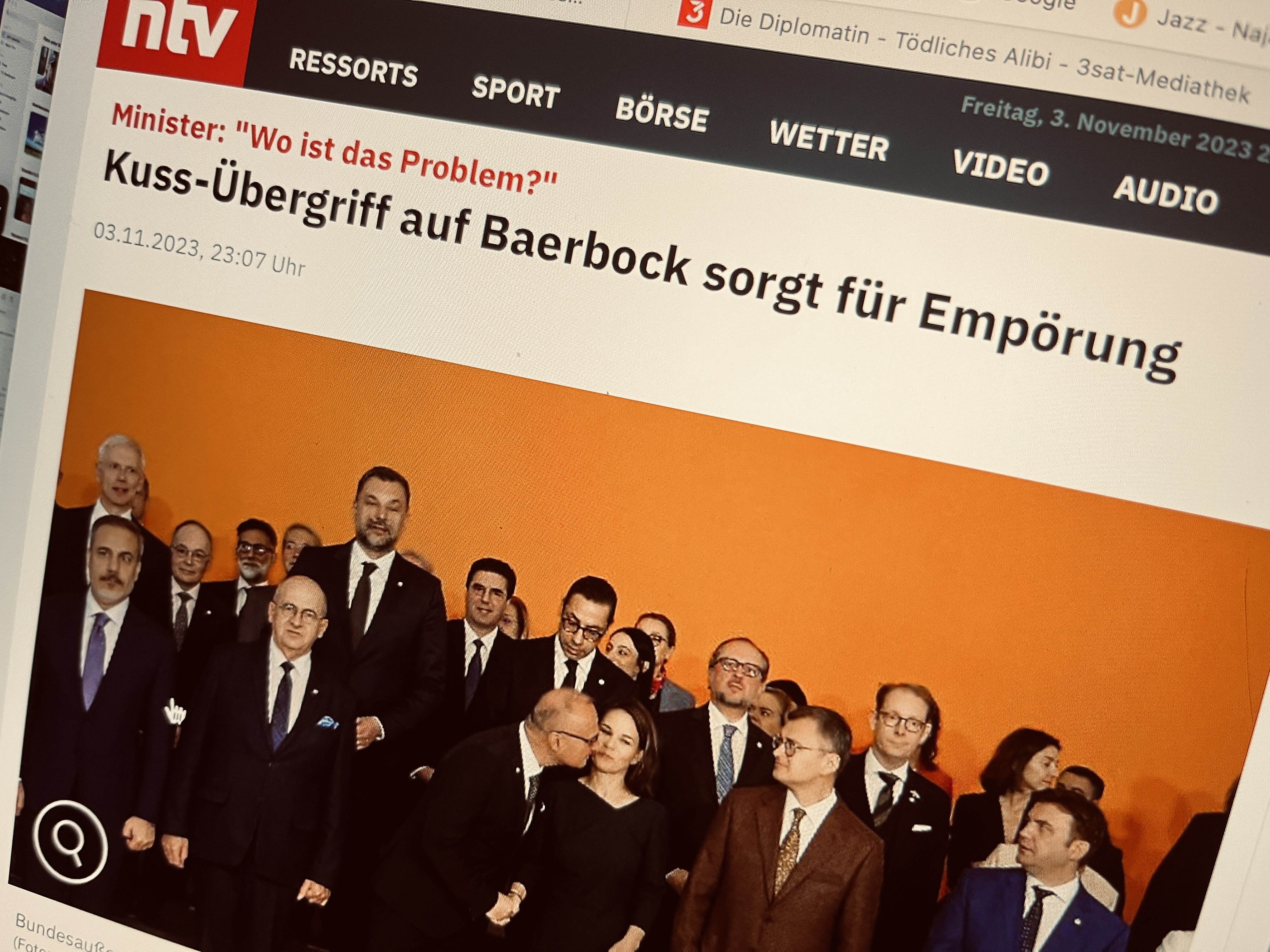 Er wisse gar nicht, wo das Problem ist. Wir grüßen einander immer herzlich, das ist eine herzliche Annäherung unter Kollegen, ließ er jene wissen, die wissen wollten, wie er zu diesem Wissen komme. Irgendwie scheint das bei Annalena Baerbock nicht angekommen zu sein. Die sichtlich überrumpelt ihren Kopf und mit ihm Wange und Mund wegdrehte. Oder der Herr Außenminister hat da aus dem EU-Knigge irgendetwas in den falschen Hals gekriegt. Was sich dann aus persönlichem Vergnügen aus dem falschen Hals zu den Lippen vorgewagt hat.