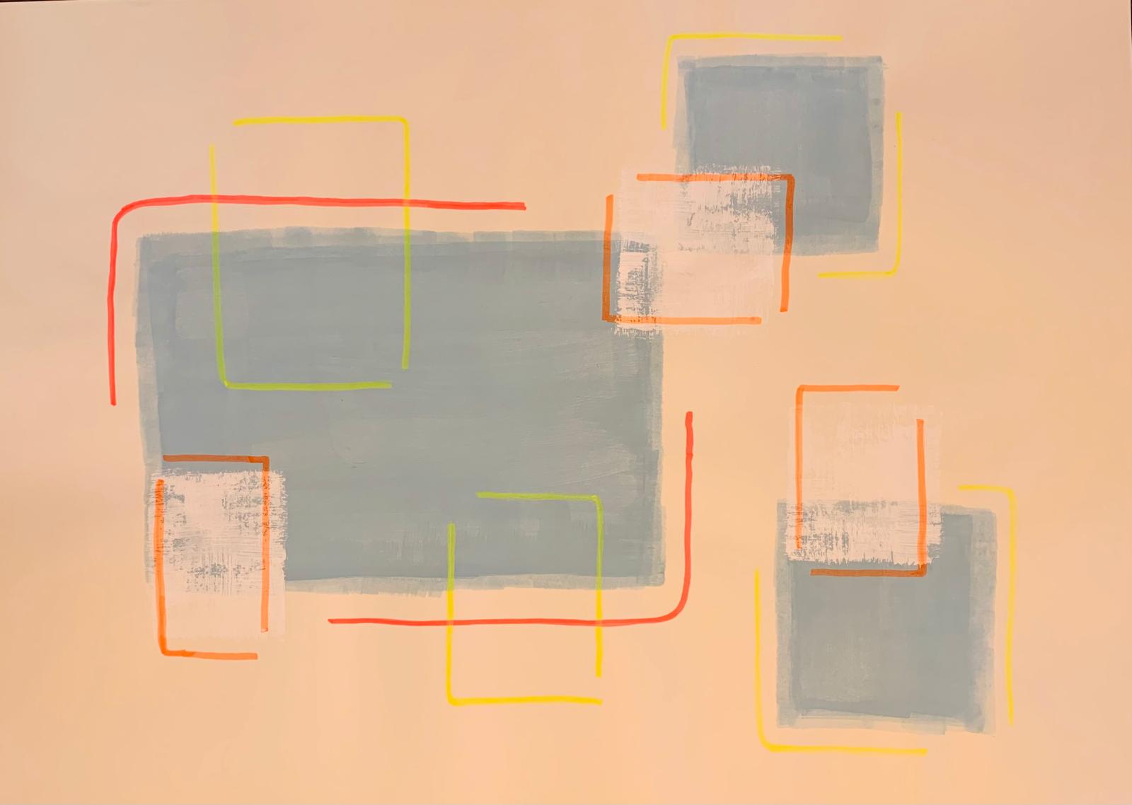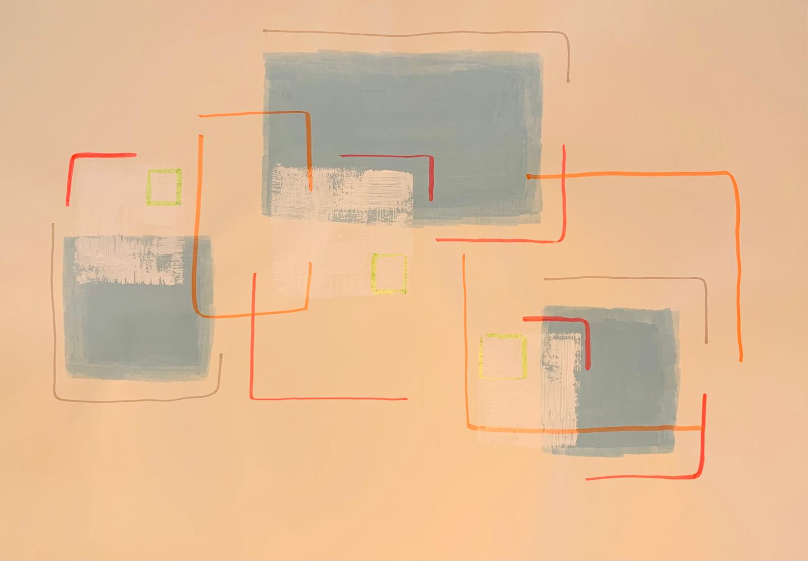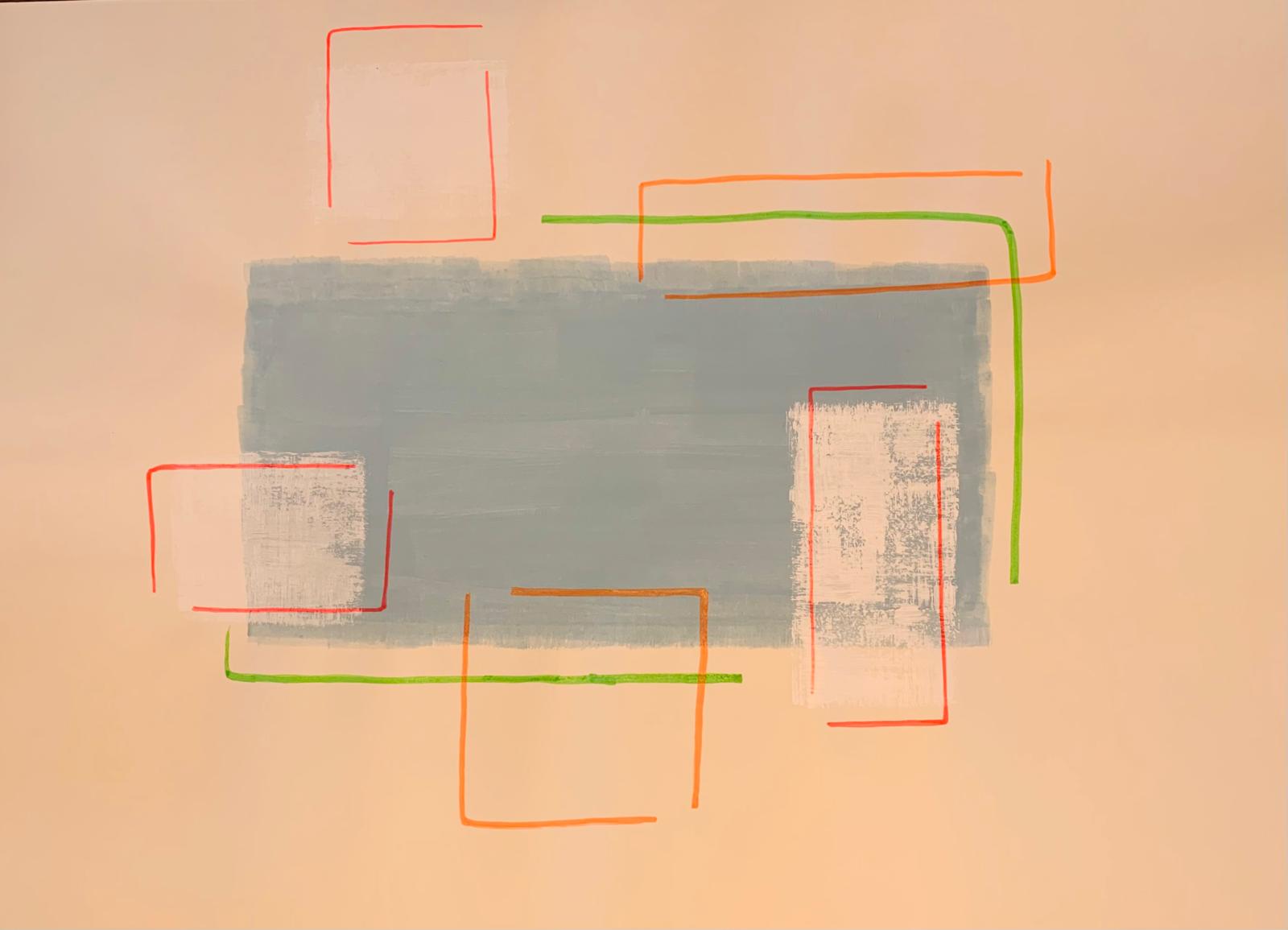 Neue Inspirationen, neue Arbeiten. Blaue Flächen, weiße Flächen. Rote Linien, die Flächen überschreiten, oder überschreiten die Flächen rote & neonfarbene Linien? Es kommt auf die Perspektive an, auf den Blickwinkel, auf Implikationen. Was darf Kunst, könnte die Frage lauten, die sich hier in auf den ersten Blick eher spielerischen Andeutungen auftut? Eine Frage, die sich auch in den vielen aktuellen Debatten um Kunst und politische Symbolik spiegelt.