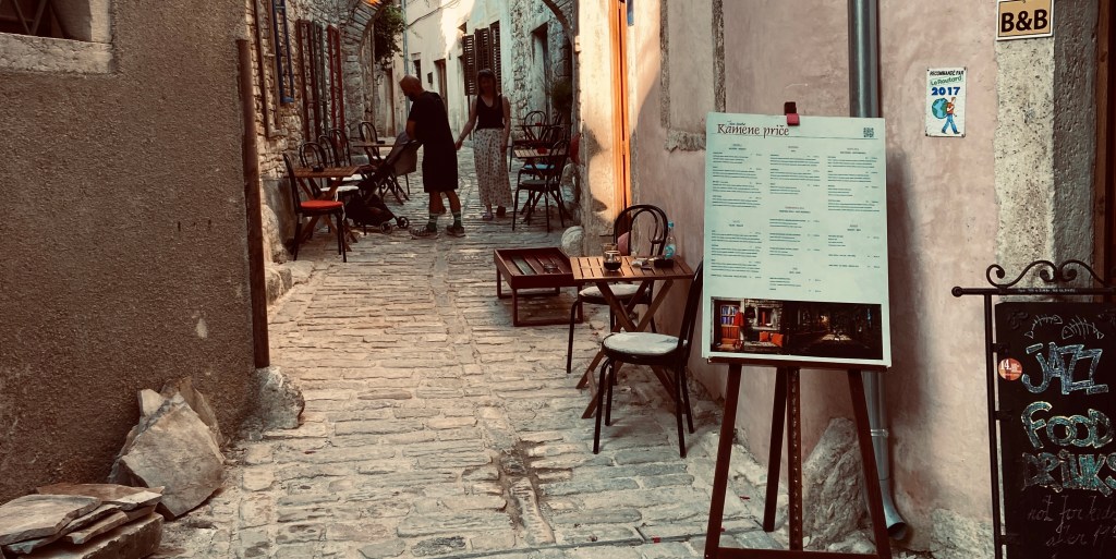 Das Kamene Priče und das Bagolar. Die zwei schönsten Plätze zum Verweilen in Bale. Das eine Jazzcafé. Mal Swiss jazz aus dem Radio. Mal sitzt eine der guten Seelen am Klavier. Das andere mit italienisch-istrianischer Famliengeschichte. Tragik und Versöhnung. Vertreibung und Rückkehr. Beides Orte zum Durchatmen. Nett und angenehm.